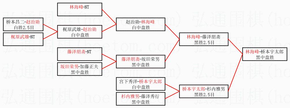 | 1.林海峰获得冠军,桥本宇太郎获得亚军。决赛比分:林海峰3:1桥本宇太郎。棋局: | ||