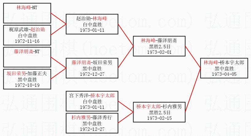 | 1.林海峰获得冠军,桥本宇太郎获得亚军。决赛比分:林海峰3:1桥本宇太郎。棋局: | ||