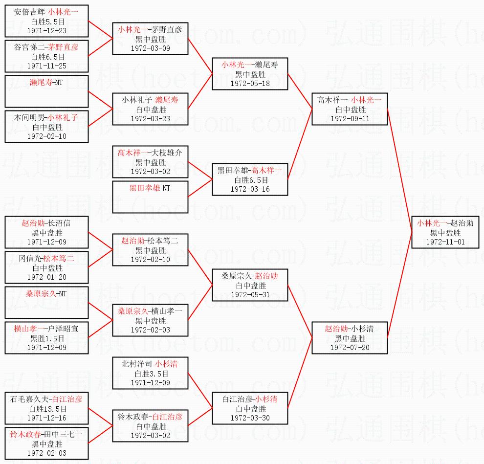 1.小林光一获得冠军,赵治勋获得亚军。决赛比分:小林光一1:0赵治勋。棋局: