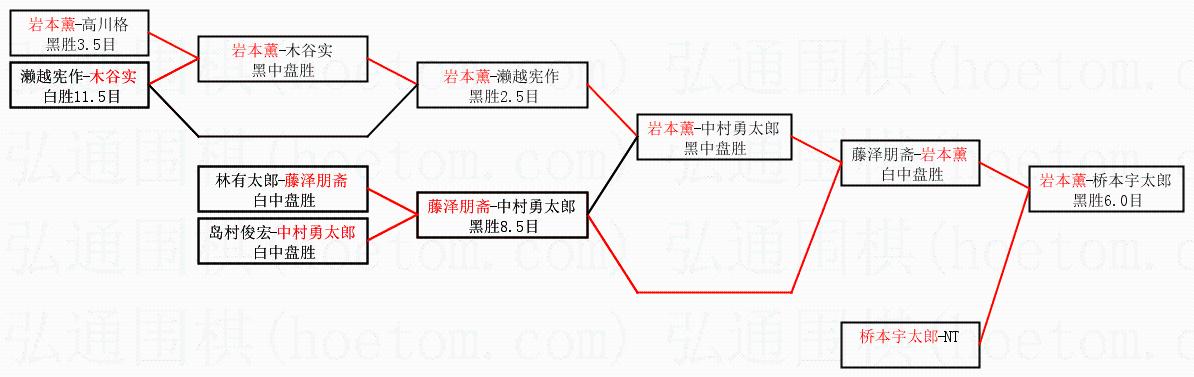 1.岩本薰获得冠军,桥本宇太郎获得亚军。决赛比分:岩本薰5:3桥本宇太郎。棋局: