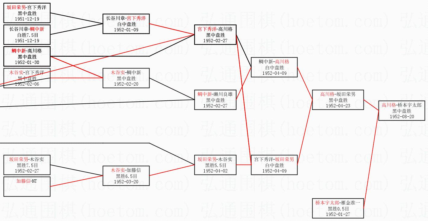 1.高川格获得冠军,桥本宇太郎获得亚军。决赛比分:高川格4:1桥本宇太郎。棋局: