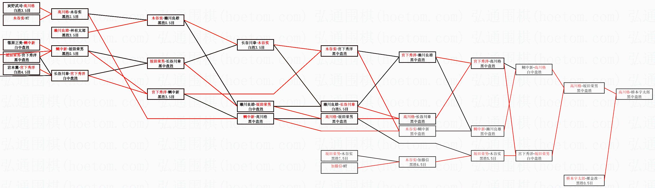 1.高川格获得冠军,桥本宇太郎获得亚军。决赛比分:高川格4:1桥本宇太郎。棋局: