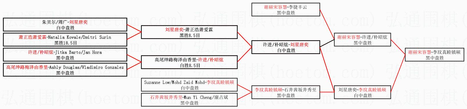 | 1.谢赫宋容慧获得冠军,李玟真睦镇硕获得亚军。决赛比分:谢赫宋容慧1:0李玟真睦镇硕。棋局: | ||