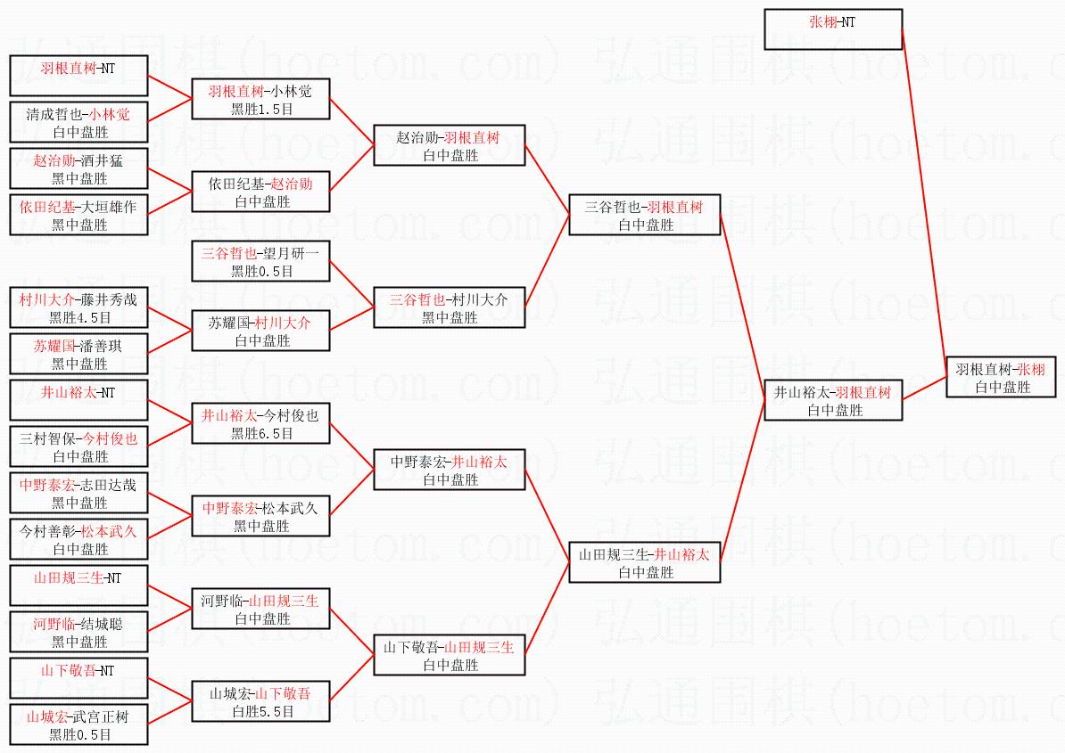 1.张栩获得冠军,羽根直树获得亚军。决赛比分:张栩3:0羽根直树。棋局: