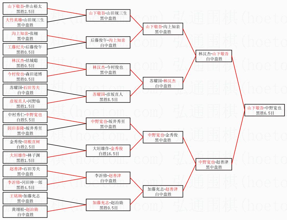 1.山下敬吾获得冠军,中野宽也获得亚军。决赛比分:山下敬吾1:0中野宽也。棋局: