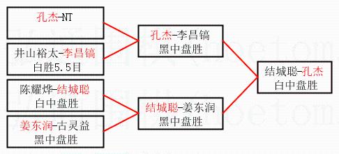 2.上半区半决赛孔杰获胜, 比分:孔杰 1:0 李昌镐。棋局: