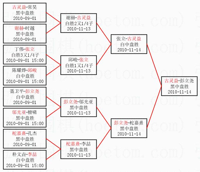 1.古灵益获得冠军,彭立尧获得亚军。决赛比分:古灵益1:0彭立尧。棋局: