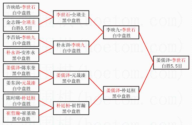 | 1.李世石获得冠军,姜儒泽获得亚军。决赛比分:李世石2:1姜儒泽。棋局: | ||