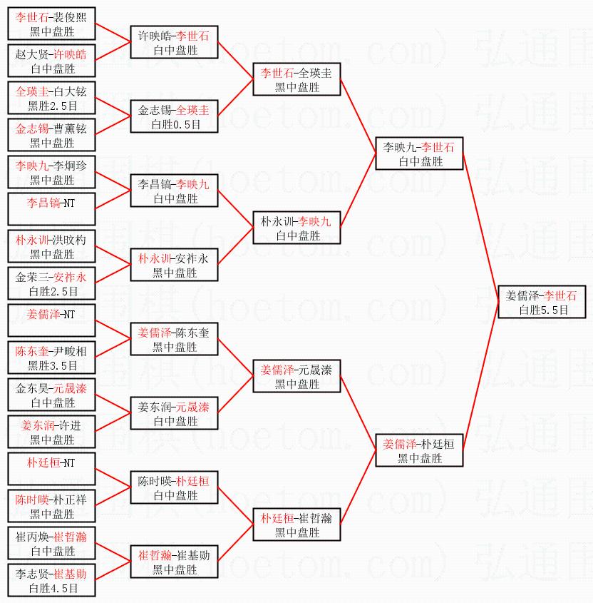 | 1.李世石获得冠军,姜儒泽获得亚军。决赛比分:李世石2:1姜儒泽。棋局: | ||