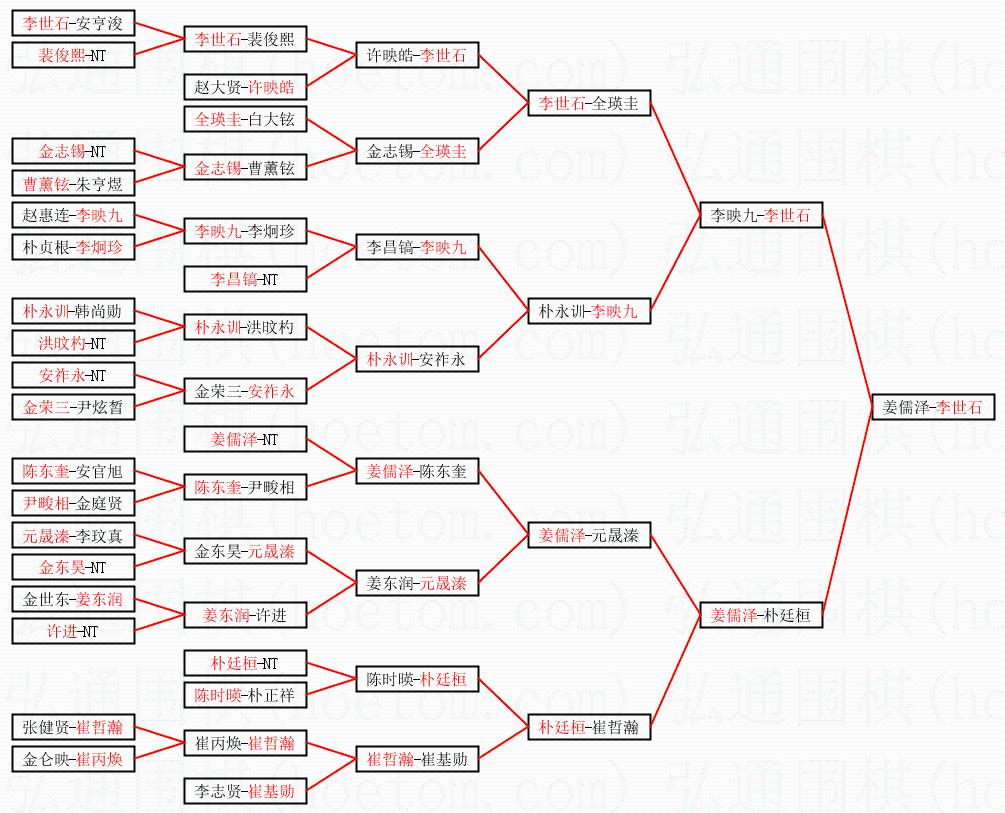 | 1.李世石获得冠军,姜儒泽获得亚军。决赛比分:李世石2:1姜儒泽。棋局: | ||
