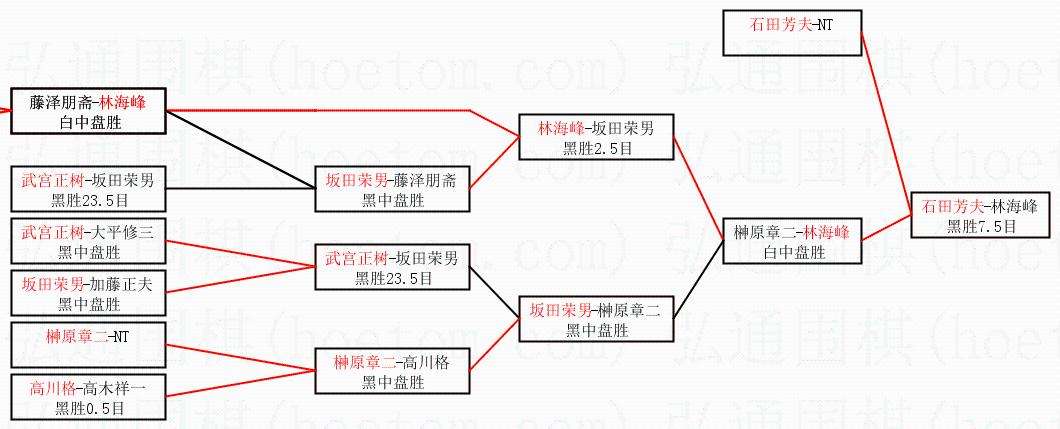| 1.石田芳夫获得冠军,林海峰获得亚军。决赛比分:石田芳夫4:0林海峰。棋局: | ||