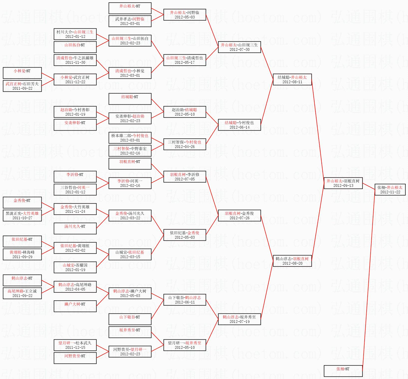 1.井山裕太获得冠军,张栩获得亚军。决赛比分:井山裕太3:0张栩。棋局: