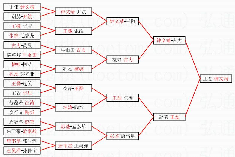 1.钟文靖获得冠军,王磊获得亚军。决赛比分:钟文靖1:0王磊。棋局: