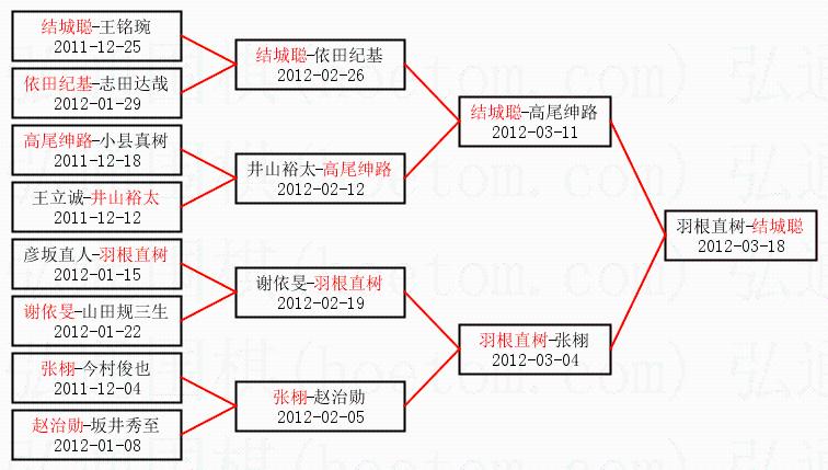 1.结城聪获得冠军,羽根直树获得亚军。决赛比分:结城聪1:0羽根直树。棋局: