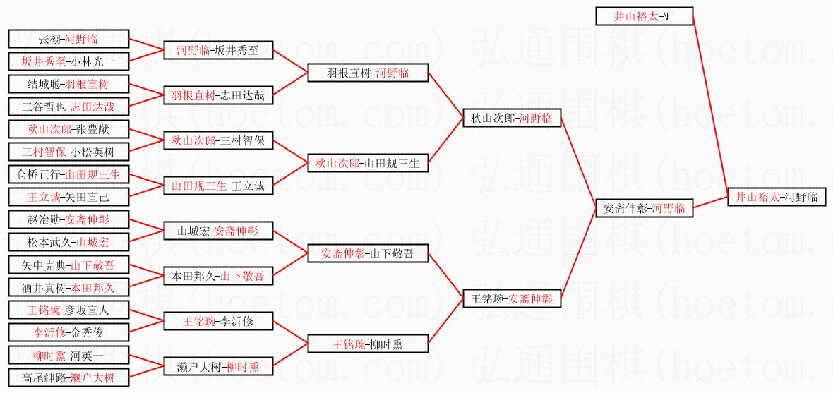 1.井山裕太获得冠军,河野临获得亚军。决赛比分:井山裕太3:0河野临。棋局: