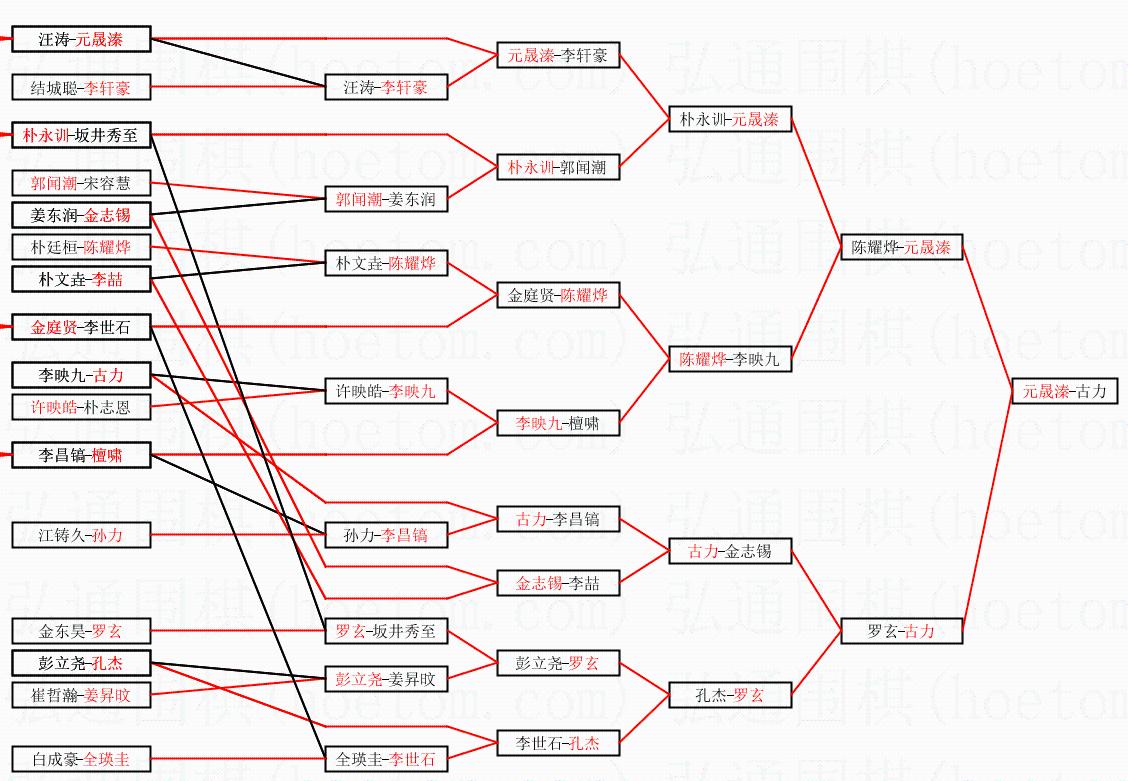 | 1.元晟溱获得冠军,古力获得亚军。决赛比分:元晟溱2:1古力。棋局: | ||