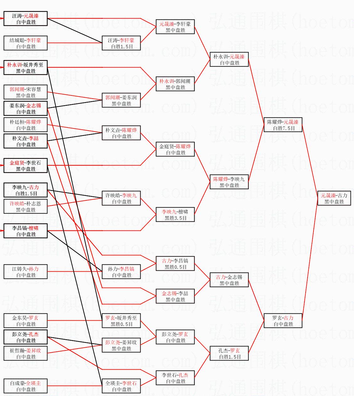 | 1.元晟溱获得冠军,古力获得亚军。决赛比分:元晟溱2:1古力。棋局: | ||