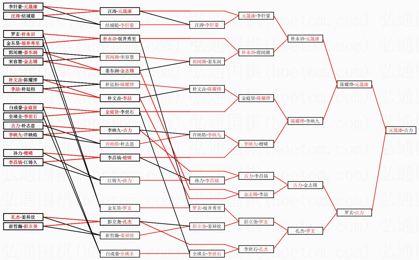 | 1.元晟溱获得冠军,古力获得亚军。决赛比分:元晟溱2:1古力。棋局: | ||