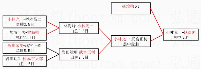 1.赵治勋获得冠军,小林光一获得亚军。决赛比分:赵治勋4:2小林光一。棋局: