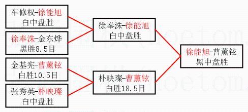 1.徐能旭获得冠军,曹薰铉获得亚军。决赛比分:徐能旭1:0曹薰铉。棋局:
