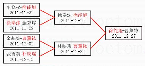 1.徐能旭获得冠军,曹薰铉获得亚军。决赛比分:徐能旭1:0曹薰铉。棋局: