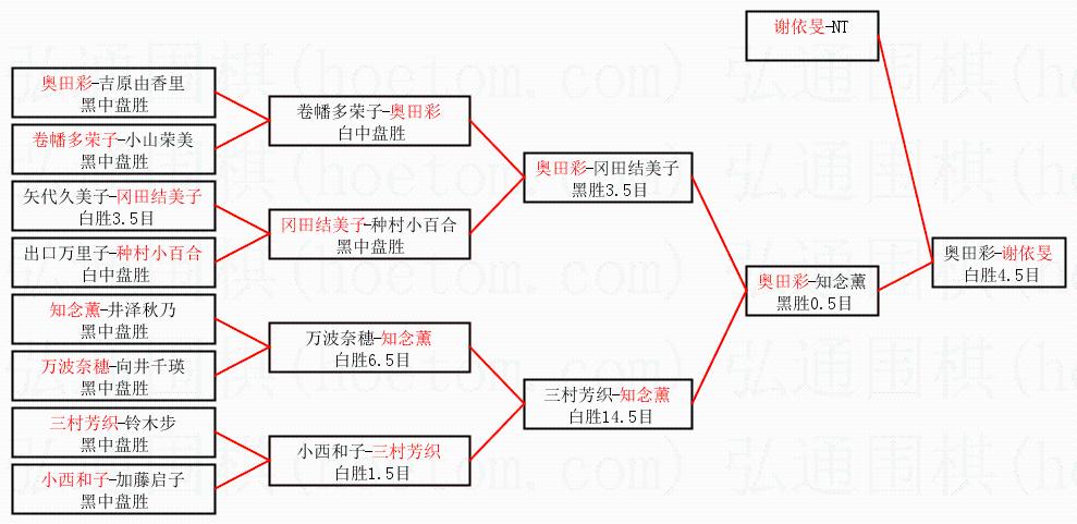 1.谢依旻获得冠军,奥田彩获得亚军。决赛比分:谢依旻3:0奥田彩。棋局: