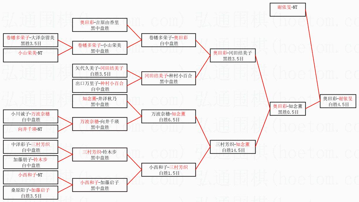 1.谢依旻获得冠军,奥田彩获得亚军。决赛比分:谢依旻3:0奥田彩。棋局: