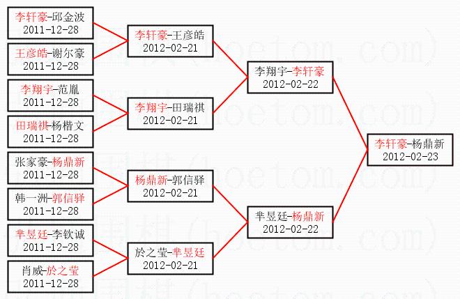 1.李轩豪获得冠军,杨鼎新获得亚军。决赛比分:李轩豪1:0杨鼎新。棋局: