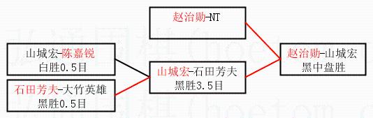 1.赵治勋获得冠军,山城宏获得亚军。决赛比分:赵治勋4:1山城宏。棋局: