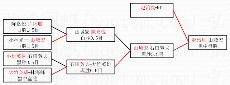 1.赵治勋获得冠军,山城宏获得亚军。决赛比分:赵治勋4:1山城宏。棋局:
