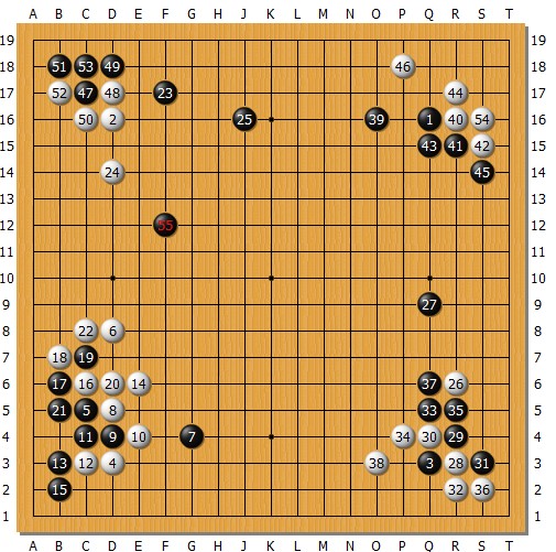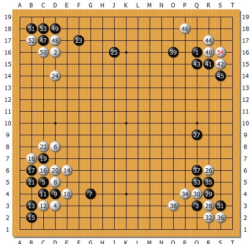 下图局面,弈至54手,黑棋左下稍亏,右边大阵有被夹入的隐患,上边还漏着风,形势断然不能说有利。黑棋应当如何打开局面?