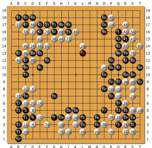 后来,顽强的白方虽然在右边掏掉了黑棋边空,但黑棋亦走得无比厚实。黑145空中一“碰”,更是体现了黑方长袖善舞的好手。此手一出,黑大空愈加饱满起来。最终经过系列收束,黑方以七目半大胜。