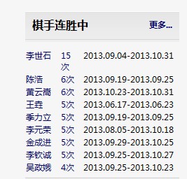 该项统计自动显示弘通围棋收录的棋谱数据中某一棋手的连胜数字。本项统计由于棋谱公布的及时程度不同,以及各国对“正式”、“非正式”比赛判断标准的不同,与官方统计数字有时或有不同,但基本可以展示出棋手的现时状态。